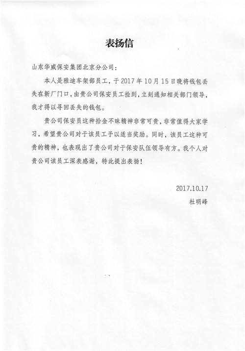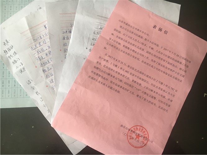 近期,曲阜分公司保安队员在执勤中做好人好事不断,当事人也分别送来多封表扬信、感谢信: 2017年8月15日,驻裕隆实业保安班队员孔祥东在巡逻时捡到钱包一个,内有...