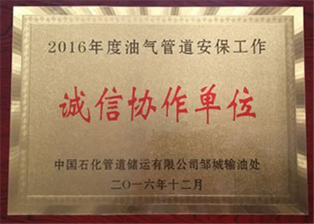 12月20日,安防公司被中石化管道储运有限公司邹城输油处授予“2016年度油气管道安保工作诚信协作单位”荣誉称号。 今年以来,由安防公司承揽的中石化管道储运有...